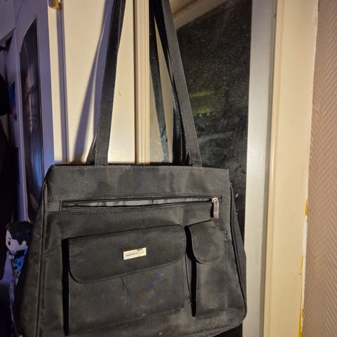 Vintage - J &J Original - veske blå m/hvite kanter, skulderstropp, høyde ca 22 cm, bredde nederst 28,5 cm, bredde øverst 21 cm, dybde bunn ca 8 cm. Selges kr 450,- pluss frakt.
