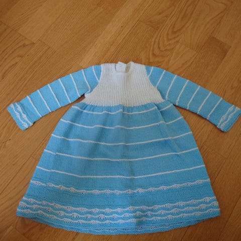 Nydelig kjole i strikk og lin. Str. 6 mnd til 2 år.