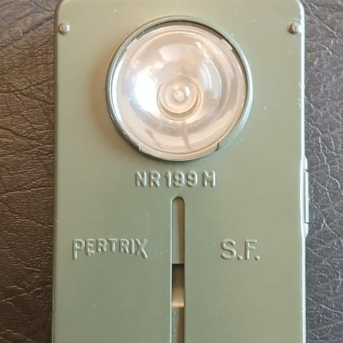 Forsvarets lommelykt. Denne bruker flatbatteri(3lr12) og har glødepære.