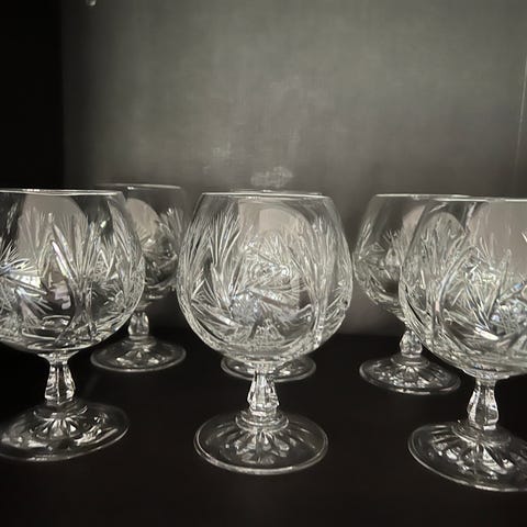 Fem fine glass med stett selges samlet.