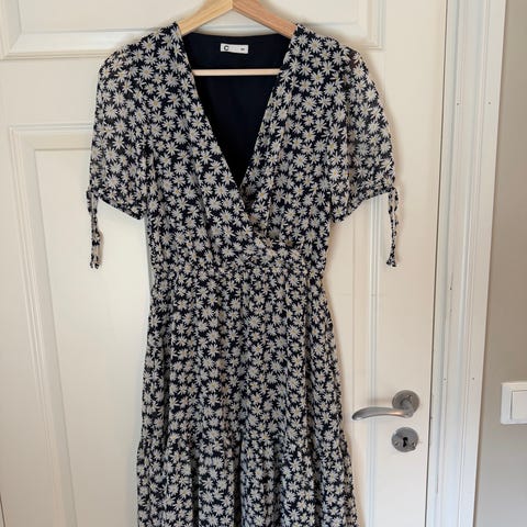Svart med små hvite blomster. Fint fall i skjørtet.