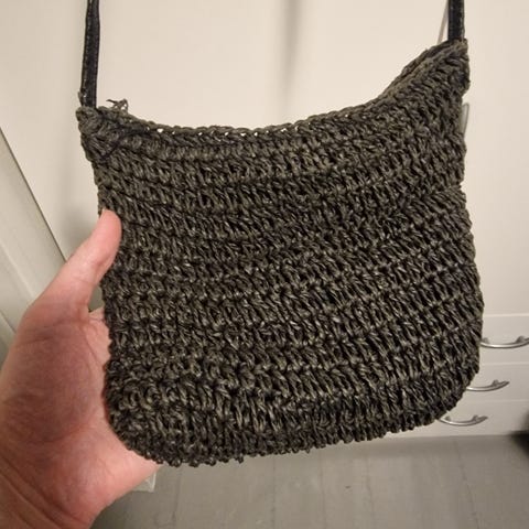 Liten, sort skulderveske med 1 stort og 1 lite rom, pluss 4 lommer, alle m/glidelås. Regulerbar og avtagbar reim og borrelås. Måler 12 x 17 cm, laget i grovt stoff m/skai. kr 75