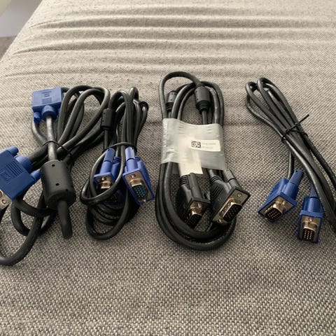 Kabler for PC-skjermer. Flere typer. VGA til VGA og VGA til DVI og DVI til DVI. Har flere enn jeg trenger. Bedre om de kan komme andre til nytte. Pris er ment pr. kabel. Pris kan diskuteres.