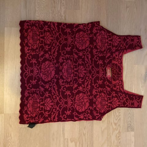 Denne toppen har en dyprød/ mørk burgunder farge. Stoffet har en ensfarget dyprød bunn med blomster i samme, men med mer skinnende farge.