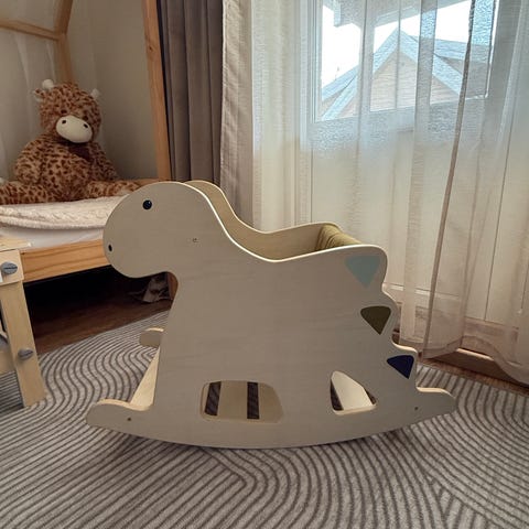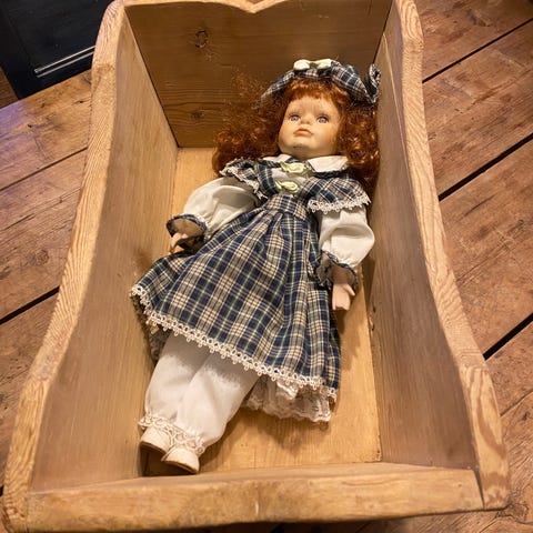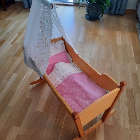 Fin håndlagd dukkevogge i tre.