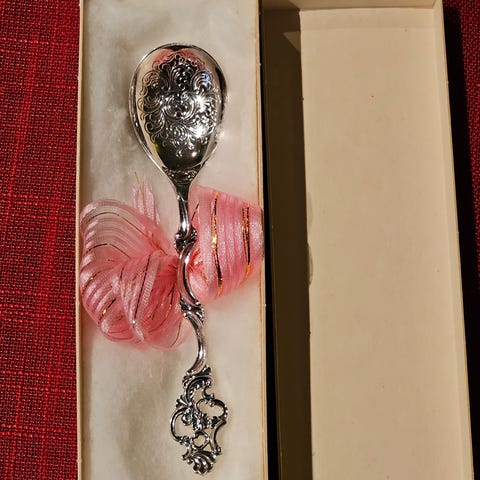 Sølvskje i 830 sølv. Samvirkelaget logo; Forbrukernes tjeneste 1892-1992.