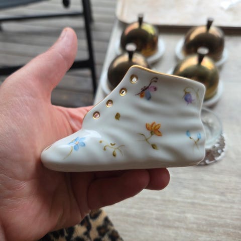 VINTAGE/RETRO PORSELEN SKO MED BLOMSTERMOTIV OG GULL DEKOR