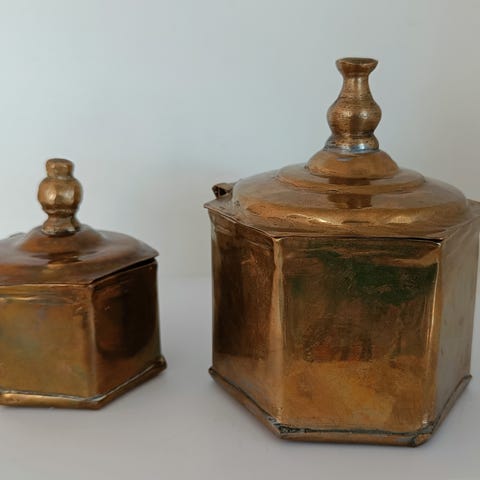 Denne har kobber bunn og hengslet lokk i messing. Noe løs i festet, ellers meget bra stand