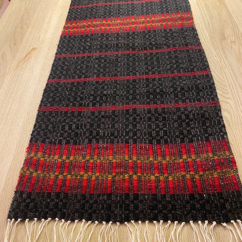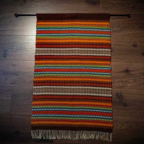 Hand vevd åkle med sort bomullsrenning og 100% ullgarn i innslag i brunt, rødfarger og hvit. Mål: 63x130 cm. + frynser. Beslag følger ikke med ! Kan sendes, kjøper betaler frakt!