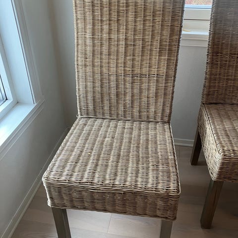 To pent bruke rottingstoler til salgs. Produksjonsår ukjent; muligens fra 50-tallet. Et lite hull i rottingen øverst til venstre på den ene stolen.