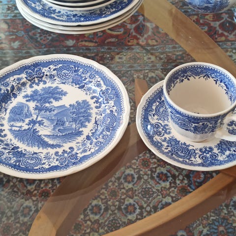 Myott Lakeside er en sjelden og utgått serie fra Staffordshire, Englands potteryvugge. Serviset har et nydelig mønster med en malerisk scene av en båt, mennesker og trær ved vannkanten. Fargene er rolige og harmoniske, og passer perfekt til et koselig måltid med familie eller venner.