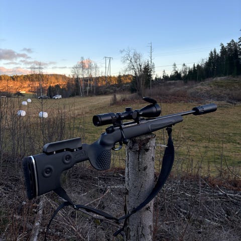 Flott rifle som er meget god og skyte med. Er foliert siden den var ny bil tru den ser så og si ny ut under folie. Selges med kikkert demper 2fot og ordentlig plast koffert.