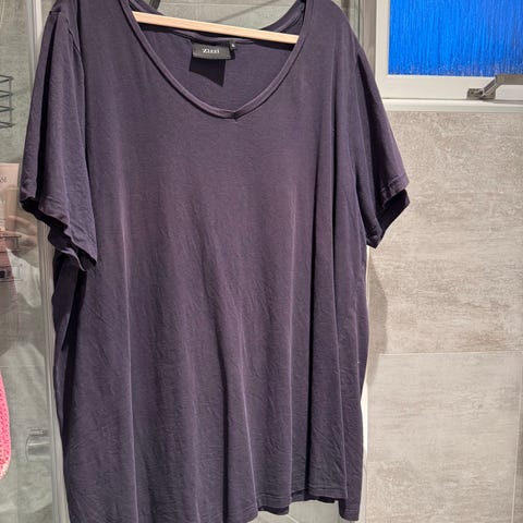 100% viskose, snøring nederst, litt vid, står XL men mer XXL