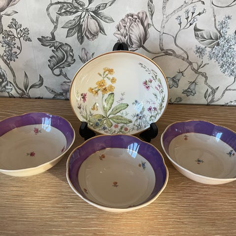 4 skåler i ulike pastellfarger. Svenske. Størrelse: 8.5x11,5 cm. Høyde 4 cm. Fremstår lite brukt. Selges samlet for 300,-