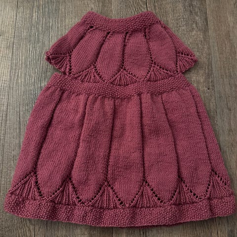 Ny og håndstrikket burgunder kjole m/hårbånd og to ulike magesnorer, i størrelse 3-4 år (mål står lenger ned). På noen av bildene ser det rødt ut, men settet er burgunder.