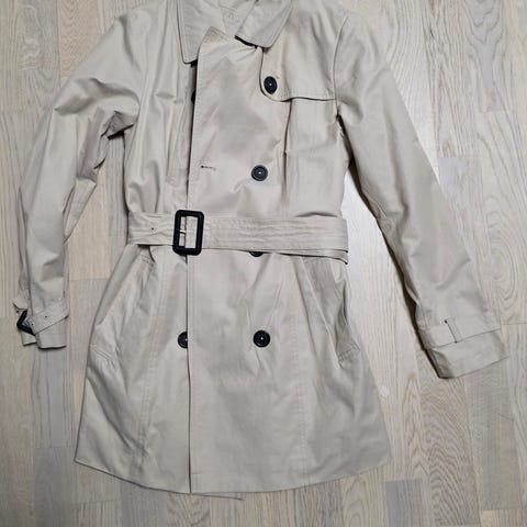 Knelang beige parkas vindjakke med innsnøring i livet om en ønsker litt mer fasong, lommer og hette, fint snitt, sydd litt lenger bak enn forran. Str 42 og merke er Vavita veil.kr 999,- selges kun 300,-((15)