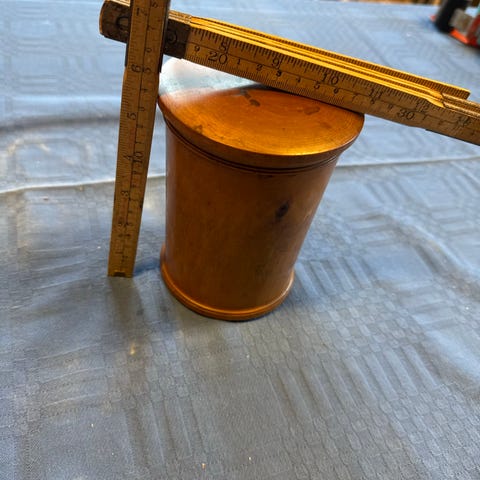 Er ikke helt sikker på hva dette heter, muligens en trebutt. Den er fra Skjåk i Gudbrandsdalen, kjøpt hos brukthandler Letrud på 1980 tallet. Noe slitt, et hull på ene siden og mangler et band. Lengde ca 25 cm.