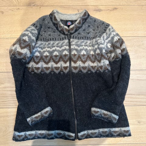Jeg bruker vanligvis størrelse L og denne er for stor for stor for meg. Derfor er den heller nesten ikke brukt. Kjøpt på Island. Jakka er foret, har glidelås, to lommer utvendig og en lomme innvendig.