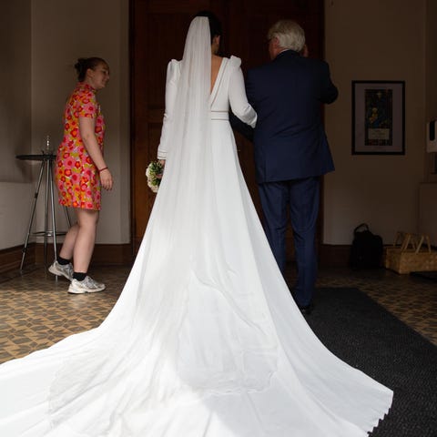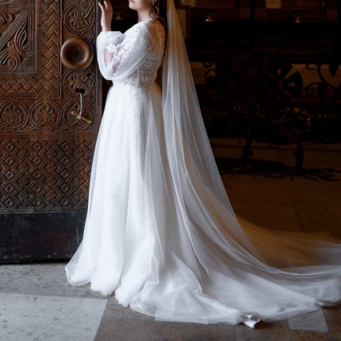 Selger min brudekjole fra Pronovias Barcelona. Kjøpt i 2019. Langermet brudekjole med blonder på hele overkroppen og åpen rygg. Nedre del av kjolen er i sateng. Kjolen er renset hos et renseri.