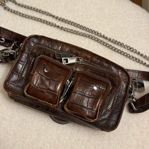 Nypris er 1700, selges for 500 kr. Lang reim i semsket skinn følger med.