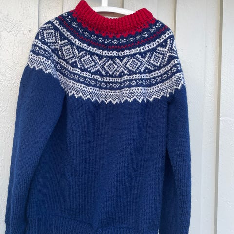 Samboeren ønsket seg en genser litt lengre enn strikkeoppskrift. Men den endte opp alt for stor! Han er en M/L. Denne er strikket i L. Men som dere ser på bildet nr 2, så er den for stor/lang.