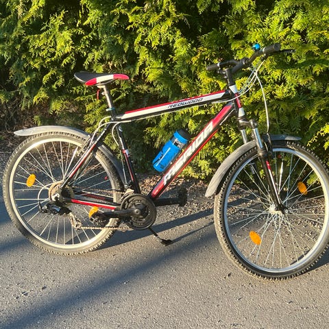 Terrengsykkel som ikke brukes veldig ofte. Har demping foran, som kan låses dersom ønskelig. Står lagret ute om sommeren, og inne om vinteren. Er i helt normal stand.