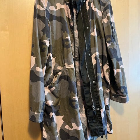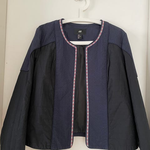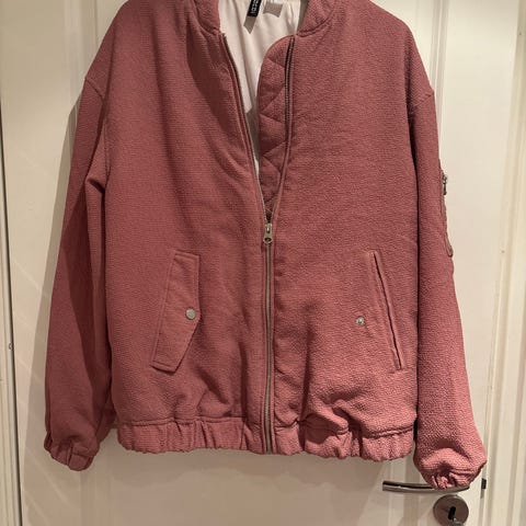 Mønstret jakke i offwhite og rosa fra H&M-merket med størrelse 38, men er liten i størrelsen og passer bedre om du bruker størrelse 36. Omkrets bryst er 92 cm, livvidde 78 cm og lengde 49 cm. Laget av en blanding av bomull, akryl og polyester. Pent brukt uten flekker eller skader.