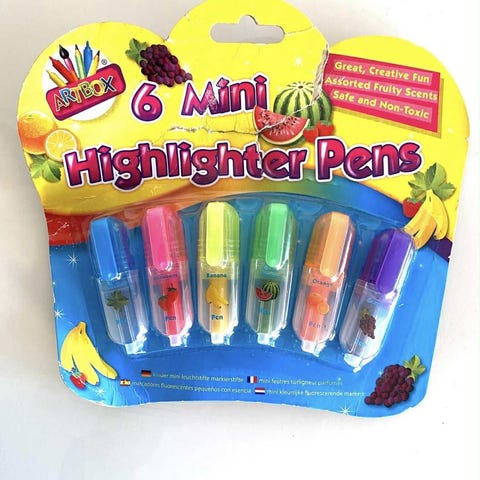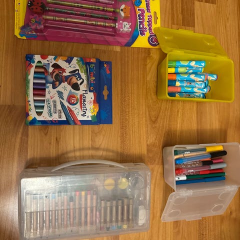 Skive med diameter 9,5 cm og fem ulike markeringstusjer