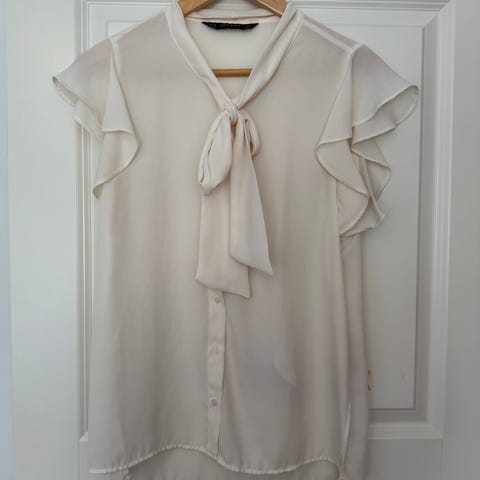 Of White bluse kjøpt på KappAhl. Veldig fin og behagelig med dekorative detaljer og litt tykt silkeaktig stoff. Pent brukt, så hel og fin. Men dessverre en flekk i front som ikke gikk av med vanlig vask (tro det er kaffe). Kan noe redde denne fine? Kan sendes mot at kjøper betaler porto.