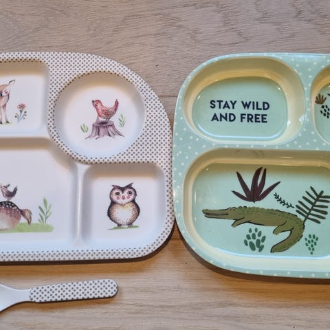 Barnetallerken/skål i plast. Med motiv av elefant, sjiraff og løve. Pris blir vi enig om. Sendes mot frakt.