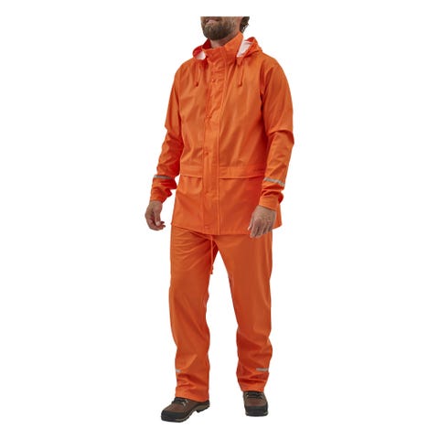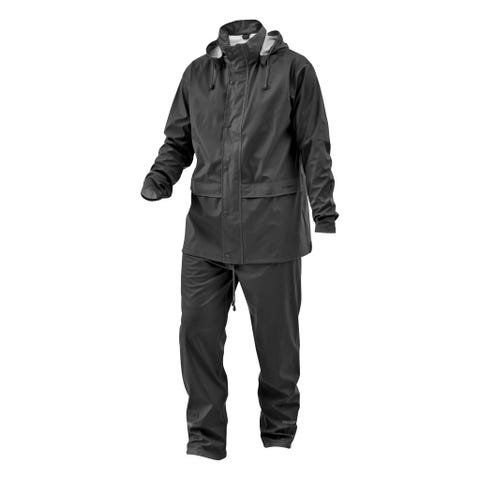 Dette lette, men slitesterk 2-stk regnsett er ideelt for alle utendørs aktiviteter, som fotturer, fiske, hagearbeid, og bygge arbeidsplasser. Den har 2 store lommer med klaff på jakken og to side skrå lommer slik at du kan nå de buksene du har på deg under regn bukse. Det er også en skjult hette i kappen kragen. De elastiske mansjetter og linning vil passe ulike størrelser for å sikre en komfortabel passform. Laget av høykvalitets PVC belagt polyester, har dette regnsettet er vanntett og slitesterk. Vennligst sjekk størrelsene nøye før du kjøper.
