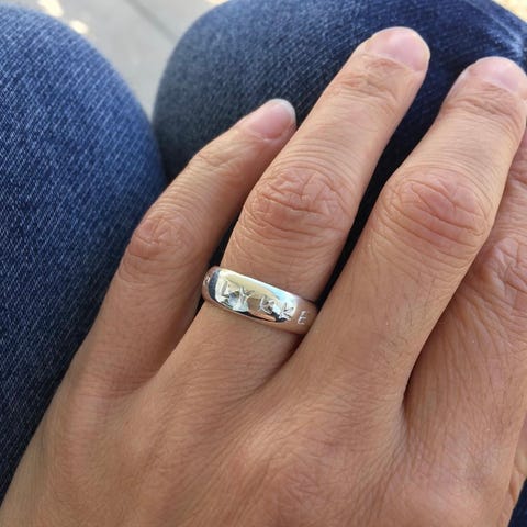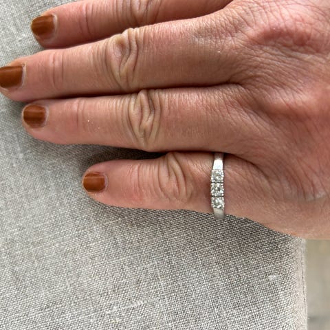 Ring i str mellom 51 og 52. Brukt i ca ett år, og har ligget i smykkeskrinet etter det. Blir den polert, vil den bli som ny. Ingen gravering inni.