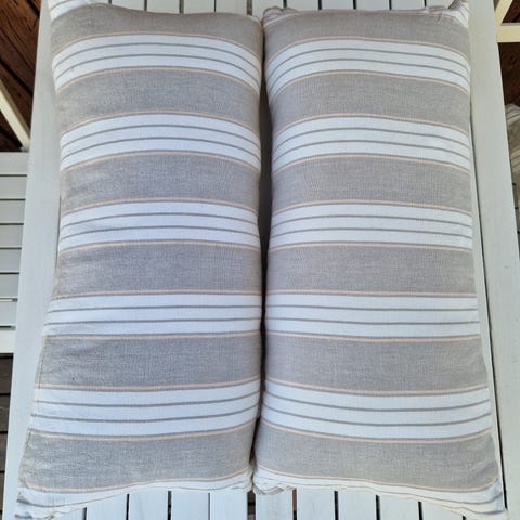 Jeg kjøpte disse av ren impuls kjøp:) hvor jeg egentlig har mange hageputer ifra før så derfor er disse 4 flotte putene forblitt ubrukt. De selges videre til noen som liker dem og har bruk for dem fortjener nytt liv 😊🌼🌼