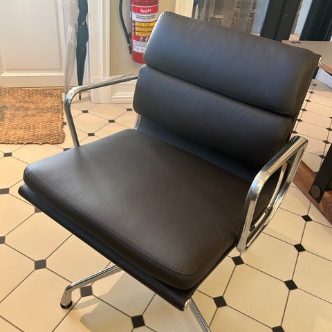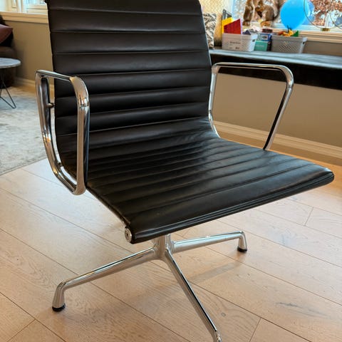 Original Vitra EA 108 i skinn. Designet i 1958 av Charles og Ray Eames og produsert av Vitra. Armlener og understell i aluminium med polert eller forkrommet overflatebehandling. Trekk i sort skinn. Tilstand: God