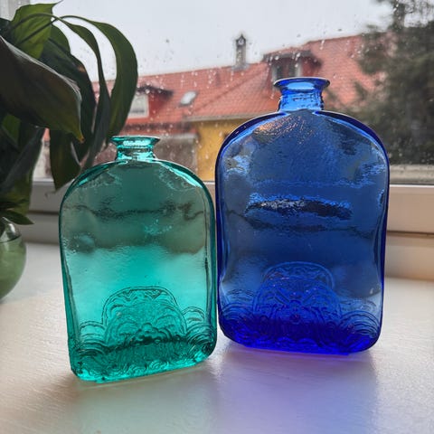 To forskjellige glassvaser med smal hals. Ligner laboratorieflasker