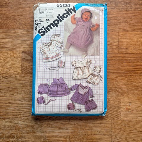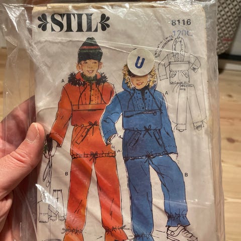 Selger pakke med syoppskrifter til baby da jeg bestemte meg for å bruke en annen oppskrift. Oppskrift A er dessverre allerede klippet opp til str. M (1 år). Noen av delene blir også brukt til andre oppskrifter. Oppskriftene er på engelsk og spansk. Av en eller annen grunn står info på baksiden på engelsk og fransk. Ny pris 149,-