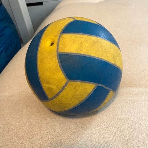 Selger en vintage badeball som i sin tid er fra isbilen. På ballen står det "hjem is". Se bilde for ca størrelses-begrep. Vanskelig å måle diameter på noe som er rundt. Blå og hvit farge. Har kun blitt blåst opp for å sjekke at den er fungerende og fri for hull. (Blåst opp med pumpe, ikke munn).