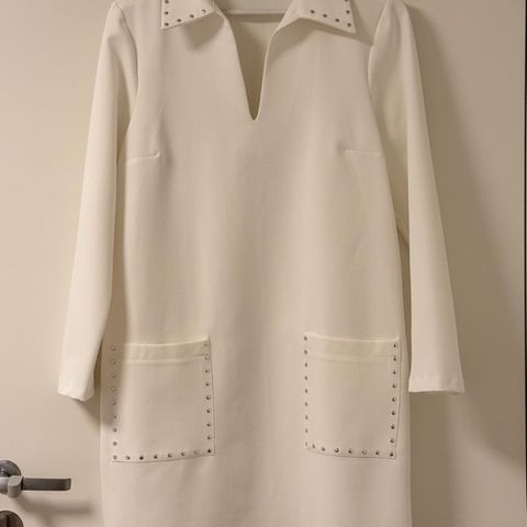 Fin kjole/ tunika i nydelig rosa farge. En kledelig fasong. Glidelås bak, lommer foran. Stoffet er av imitert skinn. Myk og elastisk. Fin detalj nede på skjørtet. Selger fordi den er litt liten for meg som egentlig bruker L.