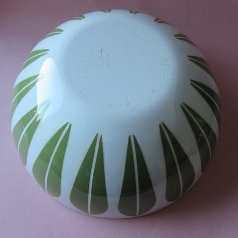 Blank og flott skål i den uvanlige fargen Lemon/Lime - lys gul bunnfarge med lys grønne Lotusblader. Bollen er 14 cm i diameter og er skinnende blank både inni og utenpå. Ingen nagg eller rust langs kanten, eneste jeg kan se er en liten mørk flekk inni (2-3 mm i diameter - se bilde), samt noen små skraper på utsiden (største er 3mm) - den ene på et av Lotusbladene (se bilde). En vakker skål som praktisk talt ser ubrukt ut. Nesten ikke en skramme under heller. Dette er et funn!