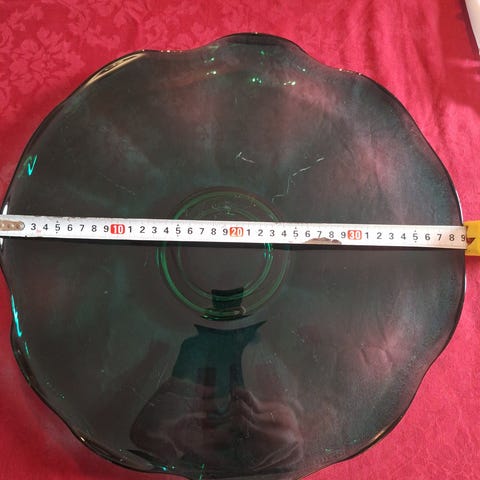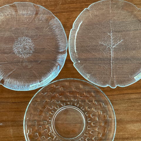 Gamle, nydelige kakefat, et gul-brunt, et svak rosa, et lys blått og et i klart glass selges for kr 100 pr. stk. Fra Hadeland Glassverk?