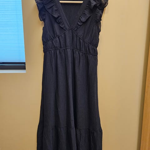 Lekker kjole i str. 36. Kan brukes med eller uten belte i livet som følger med. Beltet er tynt i samme stoff som kjolen. Dette er en kjole som ka brukes gjennom svangerskapet, ved å bruke belte til å justere kjolen etter magen størrelse. Super fin til bryllup eller andre festligheter.