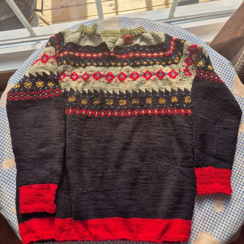 Teppet er strikket i acryl garn og passer fint for de som ikke kan bruke ull.