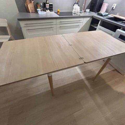 Pent brukt spisebord i Eik. Det følger også 2 plater.