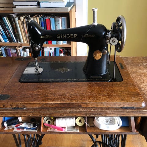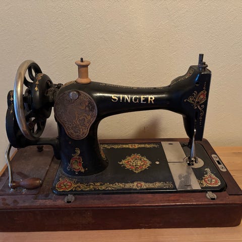 Antikk symaskin med bord.