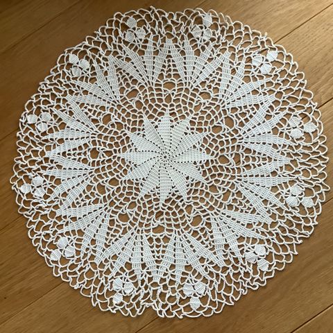 Selger en duk heklet i bomullsgarn fra Søstrene Grene. På bildet ser den lilla ut, men er mer fargen aubergine/plomme. Duken er lysere innerst.
