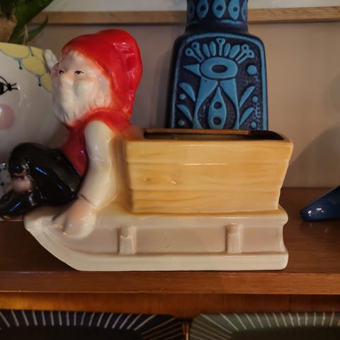 Sjekk ut denne søte her. Liten gutt som har vært og handlet. Liten, smal vase til å henge på vegg. Kan også brukes til annet, selvsagt. 14 cm høy, 6 bred og 3 dyp. Tipper den er fra 50-tallet. Made in Japan.