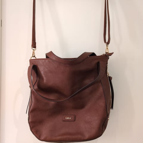Tre lommer med glidelås. To inni, 24 cm og 17 cm og en utenpå, 20 cm. To åpne lommer inni, 14 cm og 8 cm brede. Imitert skinn. Veier lite. Kort rem i imitert skinn og en lang i bomull.