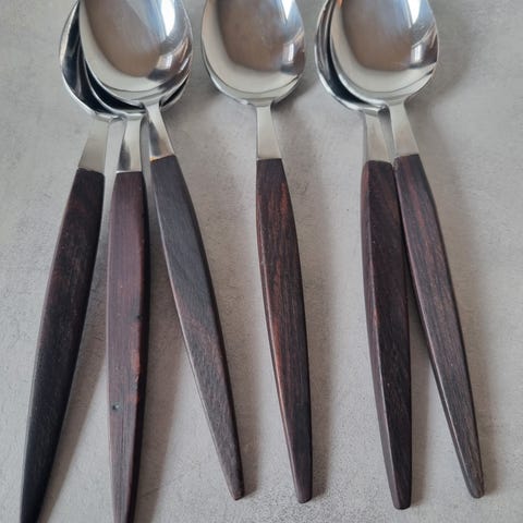 Kompottskje/ serveringsskje med skaft i palisander. Merket med "Made in Norway". Fint spill i treet som ikke kommer fram på bildene. I god stand med forventet bruksslitasje.