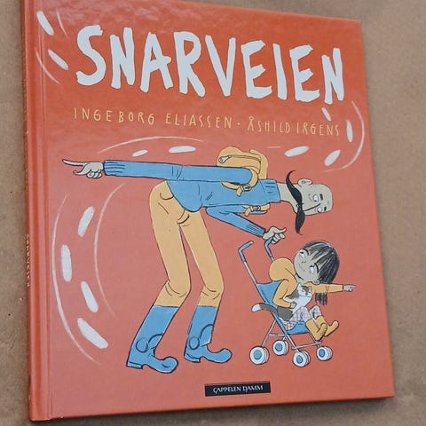 Den veien, sier Maya og peker. Først går de forbi dyrebutikken, så over brua. Etterpå må de plukke epler og hilse på hestene. Det er mye som må gjøres på vei til barnehagen – særlig når det er Maya som viser veien!"