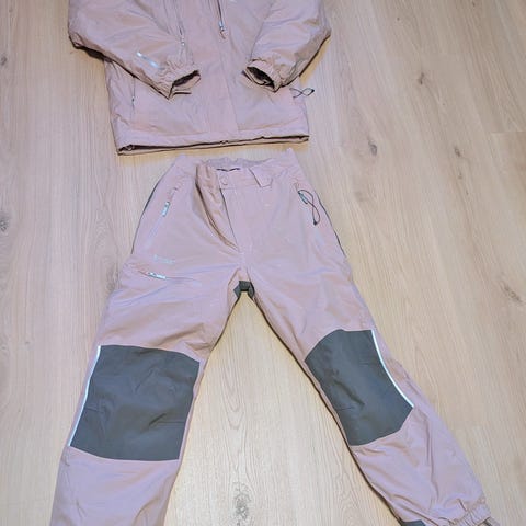 Settet er foret, vindtett og vannavvisende. Litt slitasje på knærne på buksa. Jakka er uten slitasje. Den er uten hette.